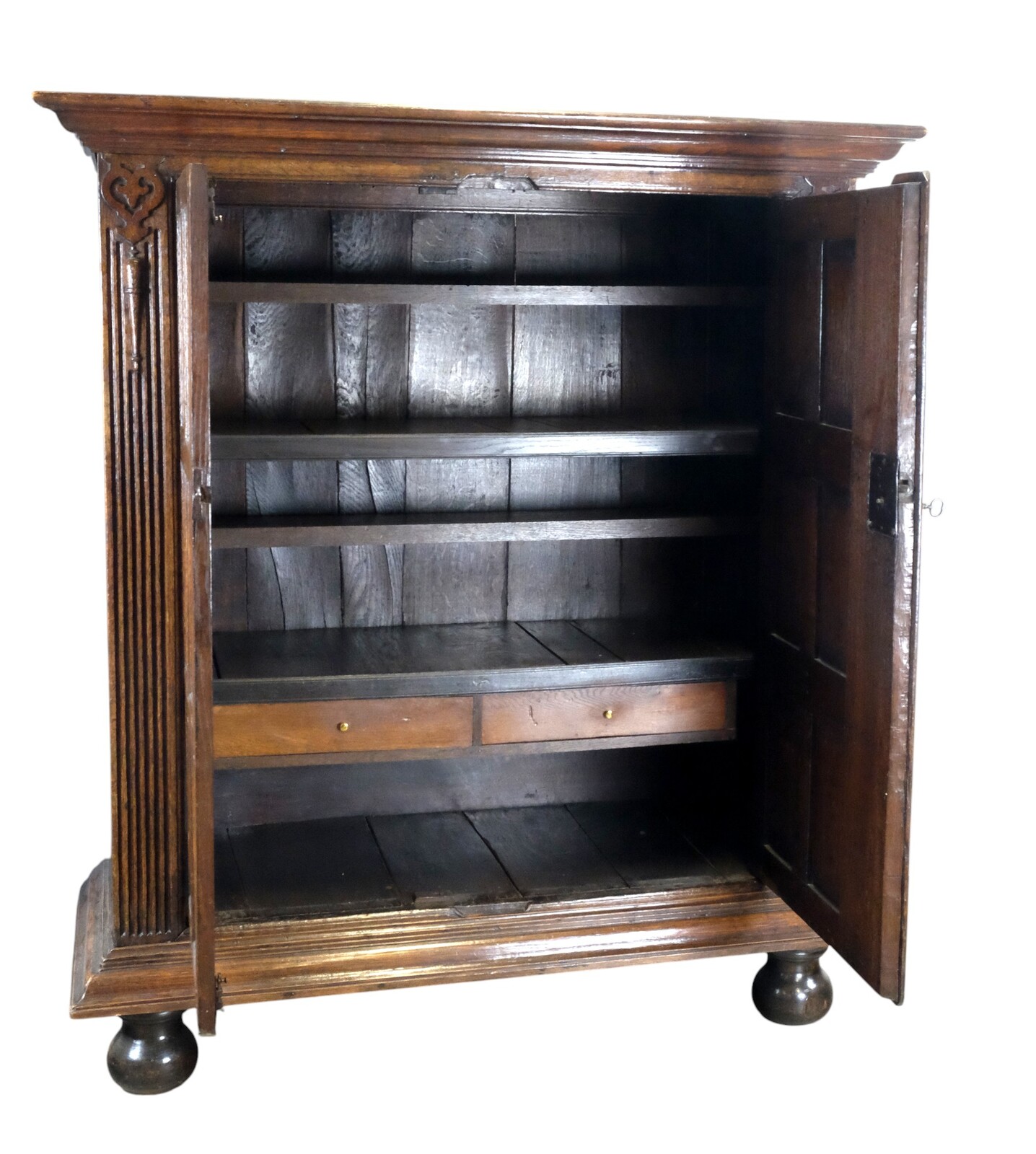 Later, two shallower shelves and two drawers were added.