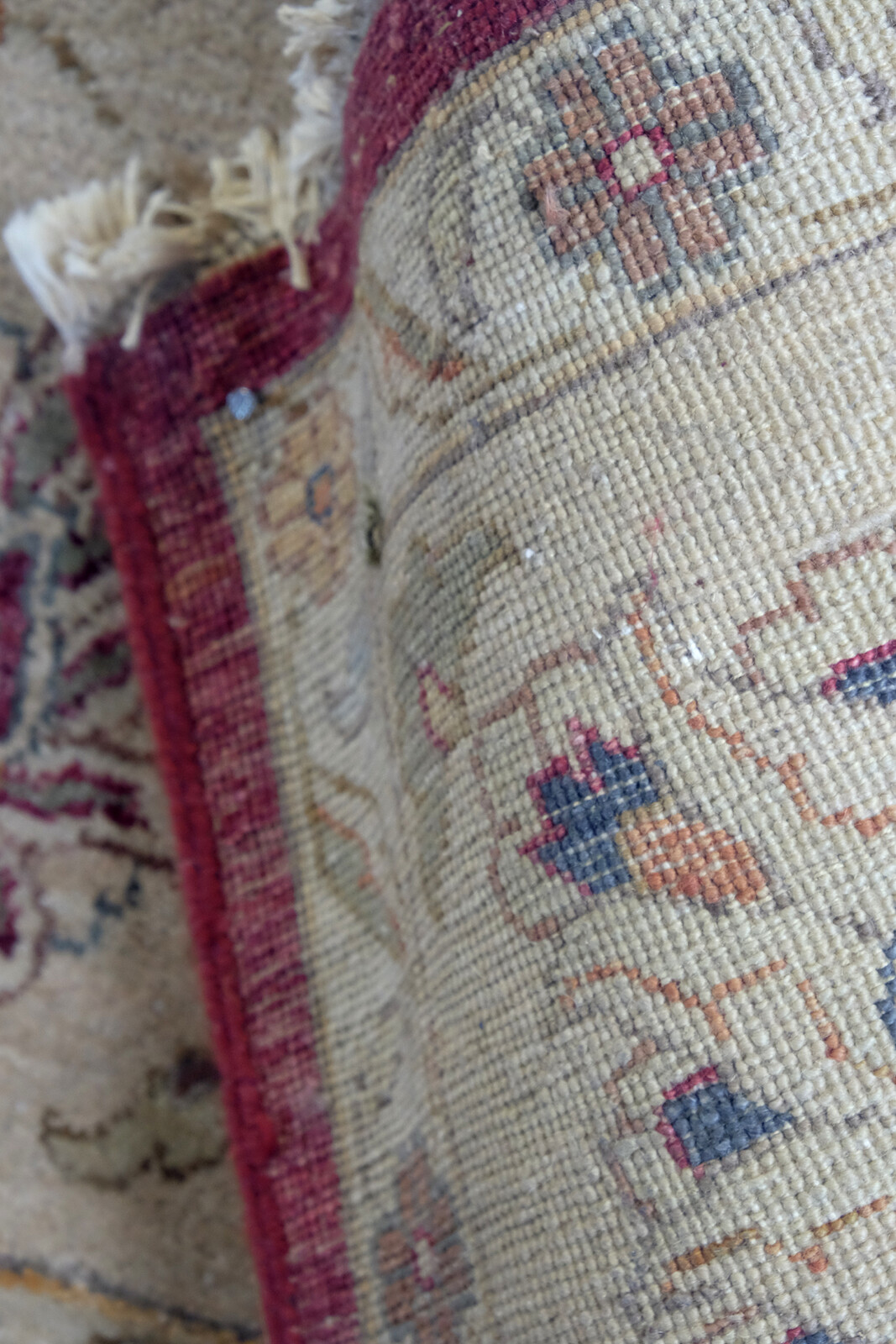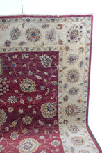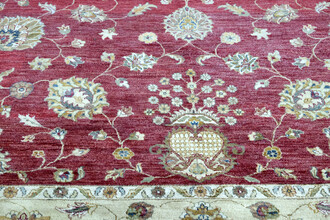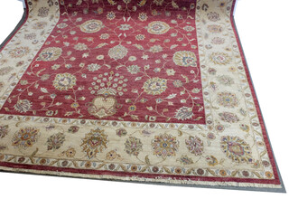 The rich, deep red center is adorned with a refined floral and vine motif, bordered by a wide cream border with harmonious floral decorations.