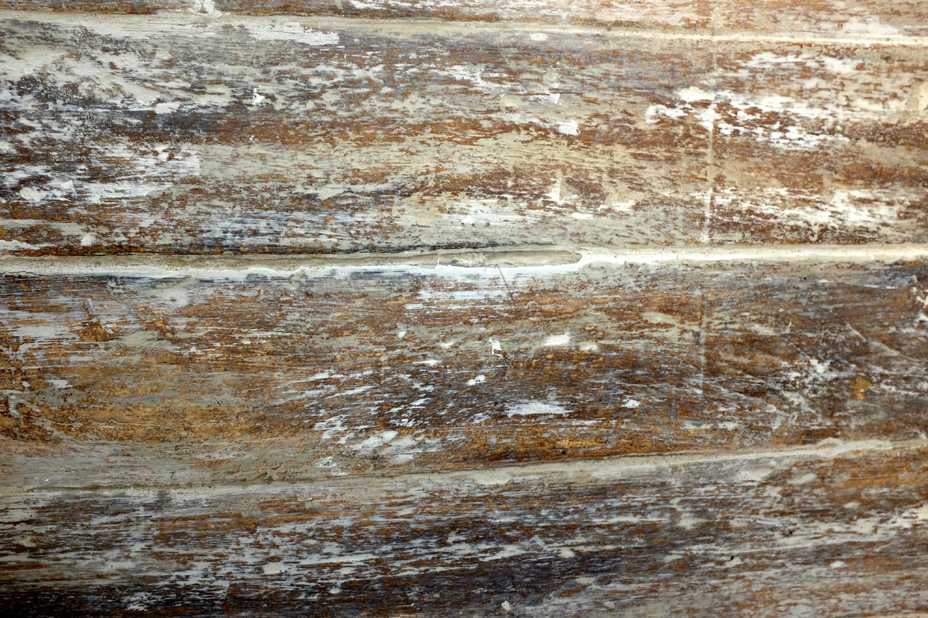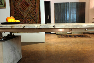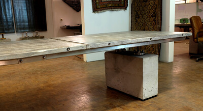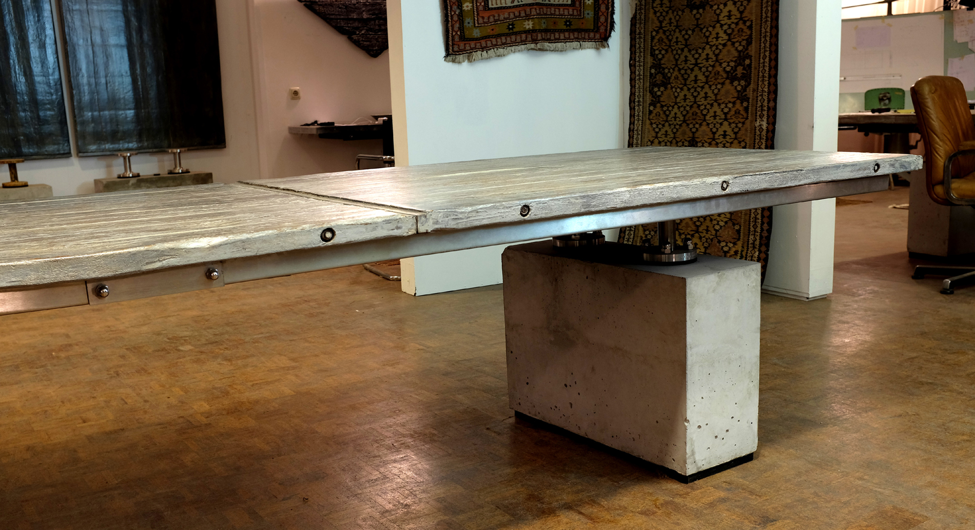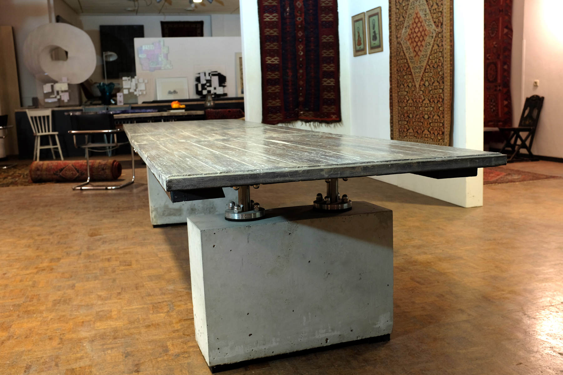 Concrete kolums with stainless steel fittings and a tabletop of old reused wood in a personal finishing.